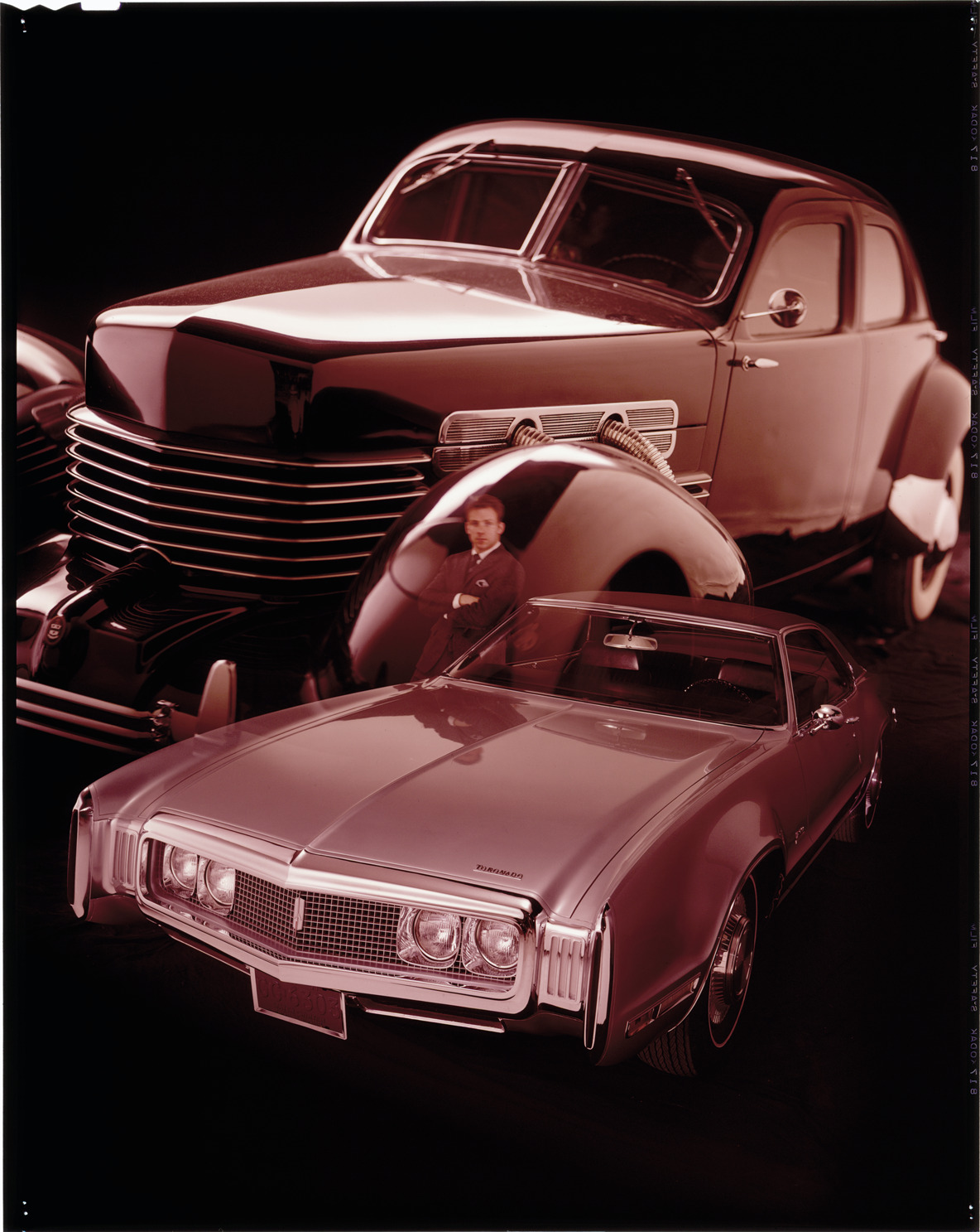 View of a man posing with a 1970 Oldsmobile Toronado coupe. Image of Cord automobile in background. Label on sleeve: "General Motors, Oldsmobile Toronado, with Cord, 1970."
