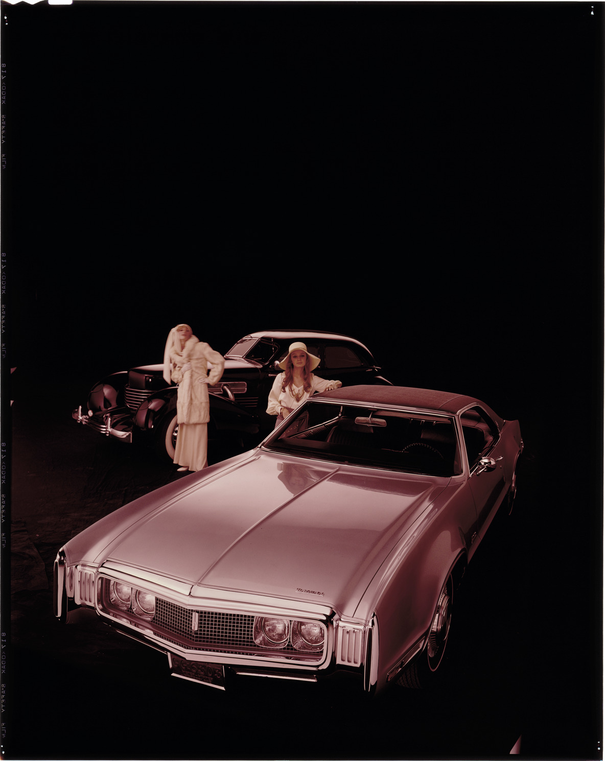View of two women posing with a 1970 Oldsmobile Toronado coupe and a Cord automobile. Label on sleeve: "General Motors, Oldsmobile Toronado, with Cord, 1970."