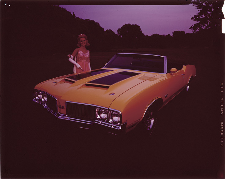 View of Pam Eldred, Miss America 1970, posing with a 1970 Oldsmobile 4-4-2 convertible. Label on sleeve: "General Motors, Oldsmobile 442, Miss America, Pam Eldred, 1970."