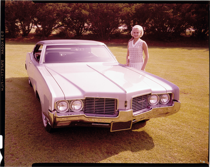 View of Judith Anne Ford, Miss America 1969, posing with a 1969 Oldsmobile Delta 88 coupe. Label on sleeve: "General Motors, Oldsmobile Delta 88, Miss America, 1969."