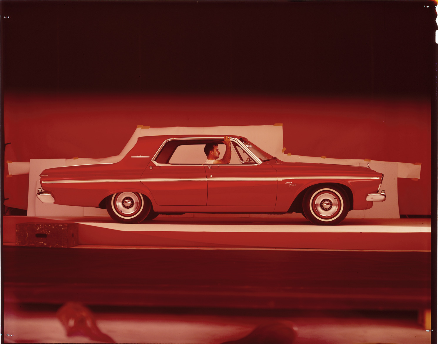View of a man posing in a 1963 Plymouth Fury sedan. Label on sleeve: "Chrysler Corp., Plymouth Fury, side view, 1963."