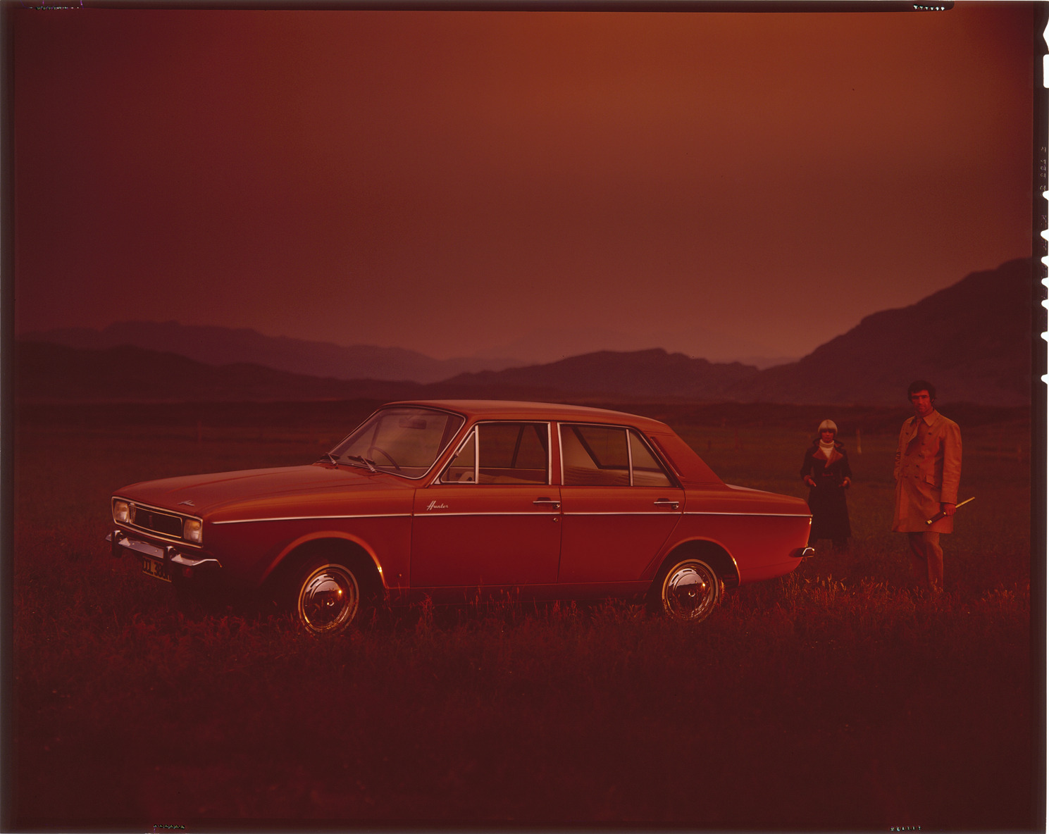 View of a man and woman posing with a 1970 Hillman Hunter sedan. Label on sleeve: "Hillman Hunter, British, 1970."