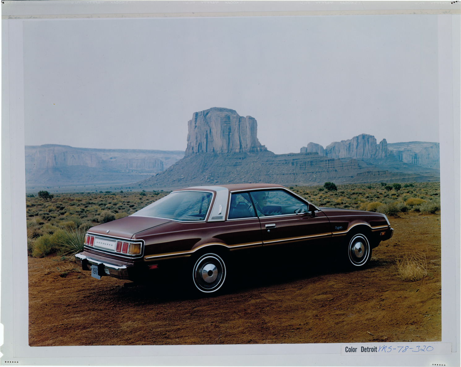 View of a man and woman in a 1978 Plymouth Sapporo coupe. Label on sleeve: "Chrysler Corp., Plymouth Sapporo, 1978."