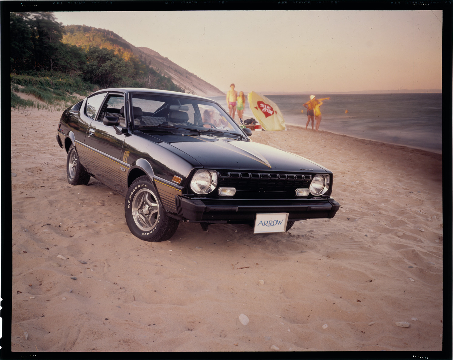 View of a 1978 Plymouth Arrow coupe on the beach. Beachgoers in background. "Me & my Arrow" is printed on beach umbrella. Label on sleeve: "Chrysler Corp., Plymouth Arrow, 1978."