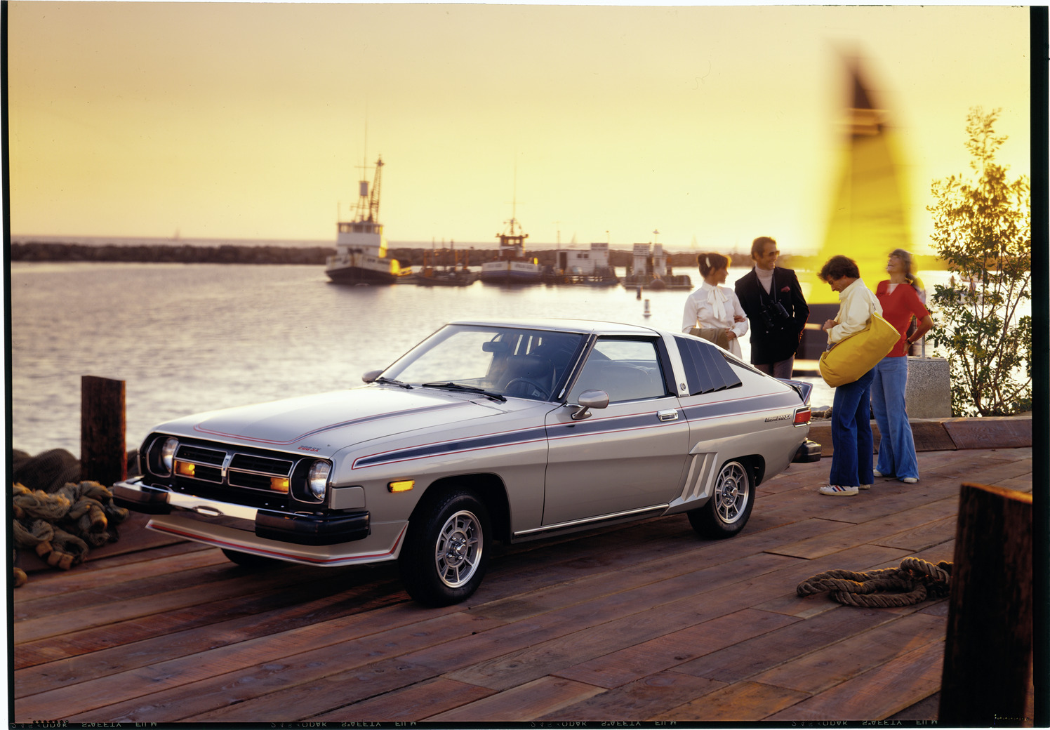 View of men and women posing with a Datsun 200SX coupe. Freighter and sailboat in background. Label on sleeve: "Datsun. Datsun 200SX, 1975-79."