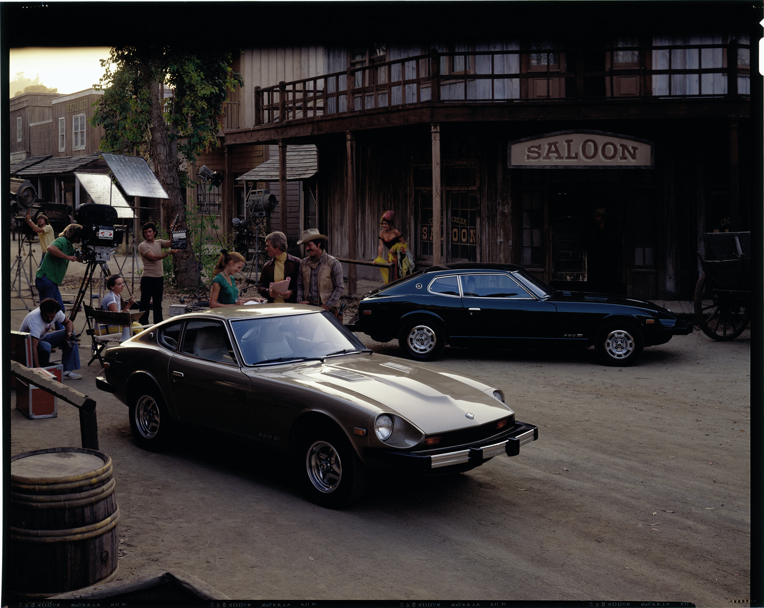 Favorite this☆ Datsun 280ZX automobiles Description: View of two Datsun 280ZX coupes on a movie set. Actors, crew and saloon in background. Label on sleeve: "Datsun. Datsun 280ZX, 1980s." Details Resource ID: na039233 Creator: Boulevard Photographic (Firm) Subject: Datsun automobile Advertising--Automobiles Transparencies Date Issued: Unknown year in the decade of the 1980s Format: 1 transparency : col. ; 8 x 10 in. Member of: National Automotive History Collection Mickey McGuire and Jim Northmore Boulevard Photographic Collection Filing Location: Datsun, 14:10 Rights: Physical rights are retained by DPL. Copyright is retained in accordance with U.S. copyright laws.