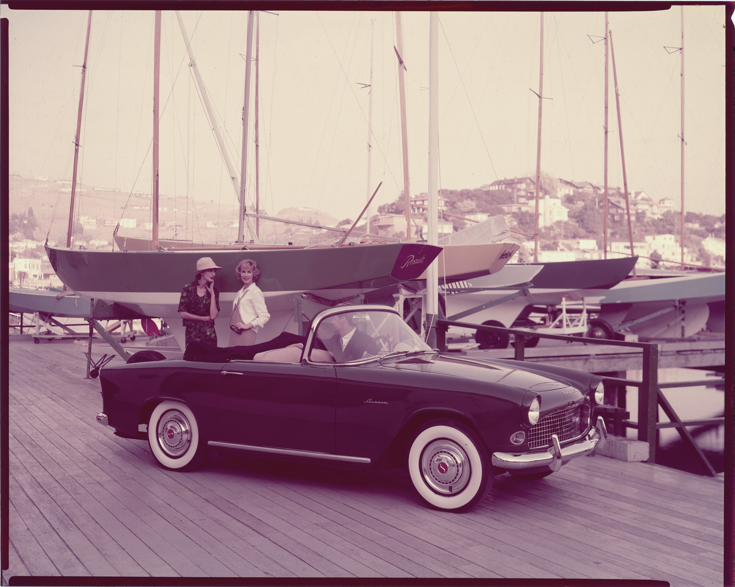 Favorite this☆ 1959 Simca Oceane automobile Description: View of a man and two women posing with a 1959 Simca Oceane convertible. Sailboats in background. Label on sleeve: "Chrysler Corp. (Import), Simca Oceane, 1959." Details Resource ID: na039268 Creator: Boulevard Photographic (Firm) Subject: Simca automobile Automobiles, Convertible Sailboats Advertising--Automobiles Transparencies Date Issued: 1959 Format: 1 transparency : col. ; 8 x 10 in. Member of: National Automotive History Collection Mickey McGuire and Jim Northmore Boulevard Photographic Collection Filing Location: Simca, 13:13 Rights: Physical rights are retained by DPL. Copyright is retained in accordance with U.S. copyright laws.