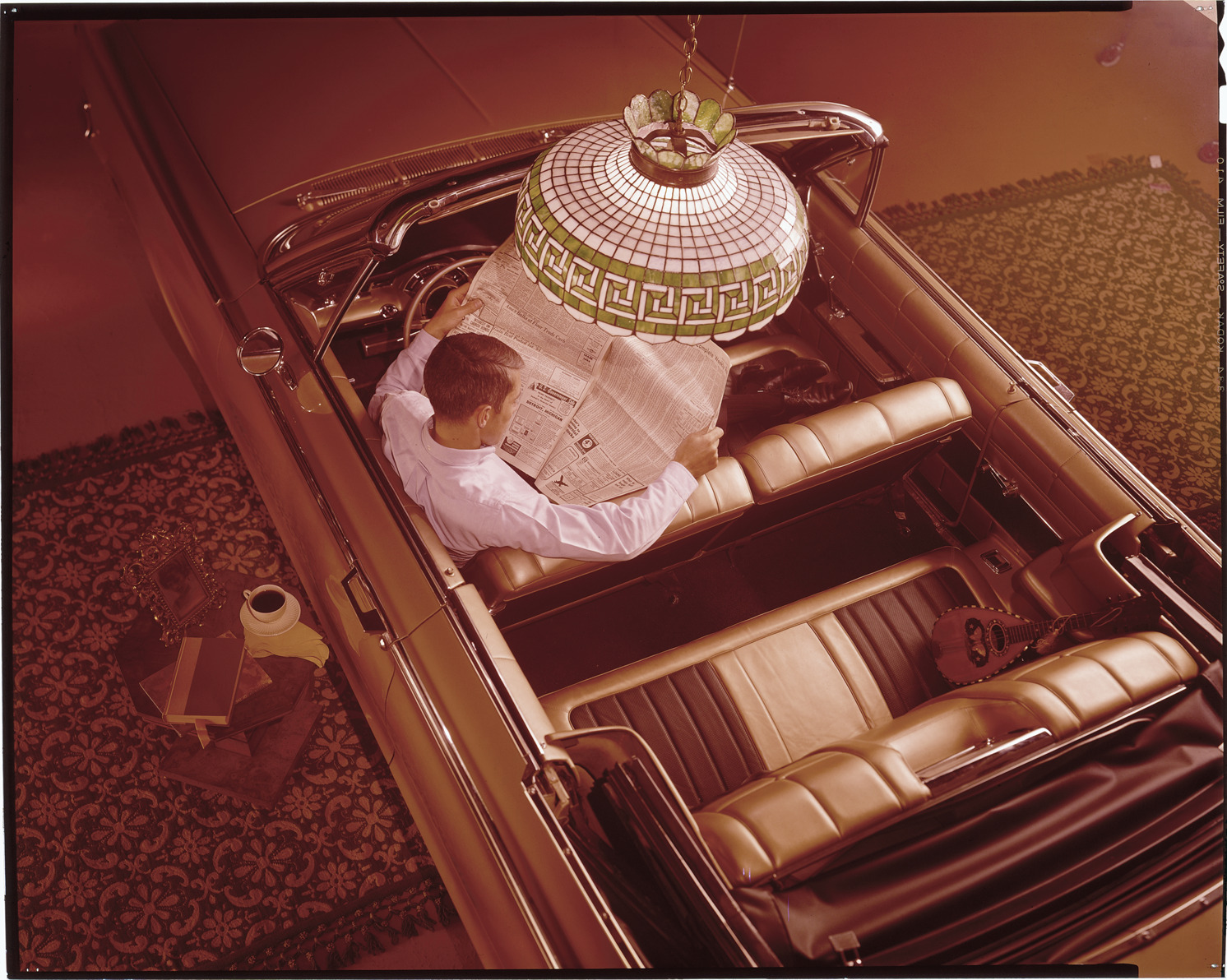 View of a man reading a newspaper in a 1965 Chrysler convertible. Tiffany-style lampshade is overhead; table with book, coffee cup and framed photograph is next to car. Label on sleeve: "Chrysler Corporation, Chrysler convertible, 1965."