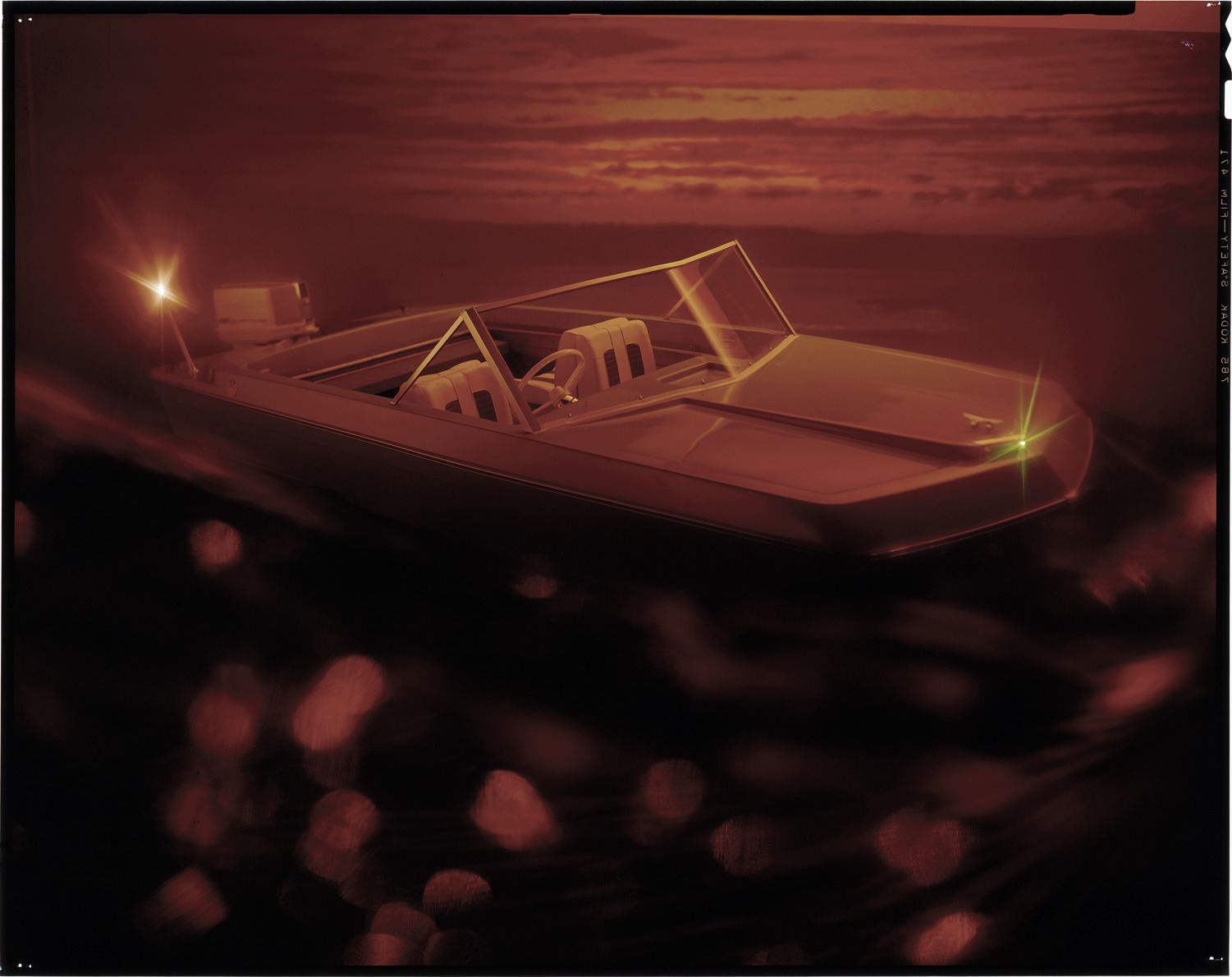 View of a Chrysler motorboat with outboard motor. Label on sleeve: "Chrysler Corporation, Marine Division, unknown."