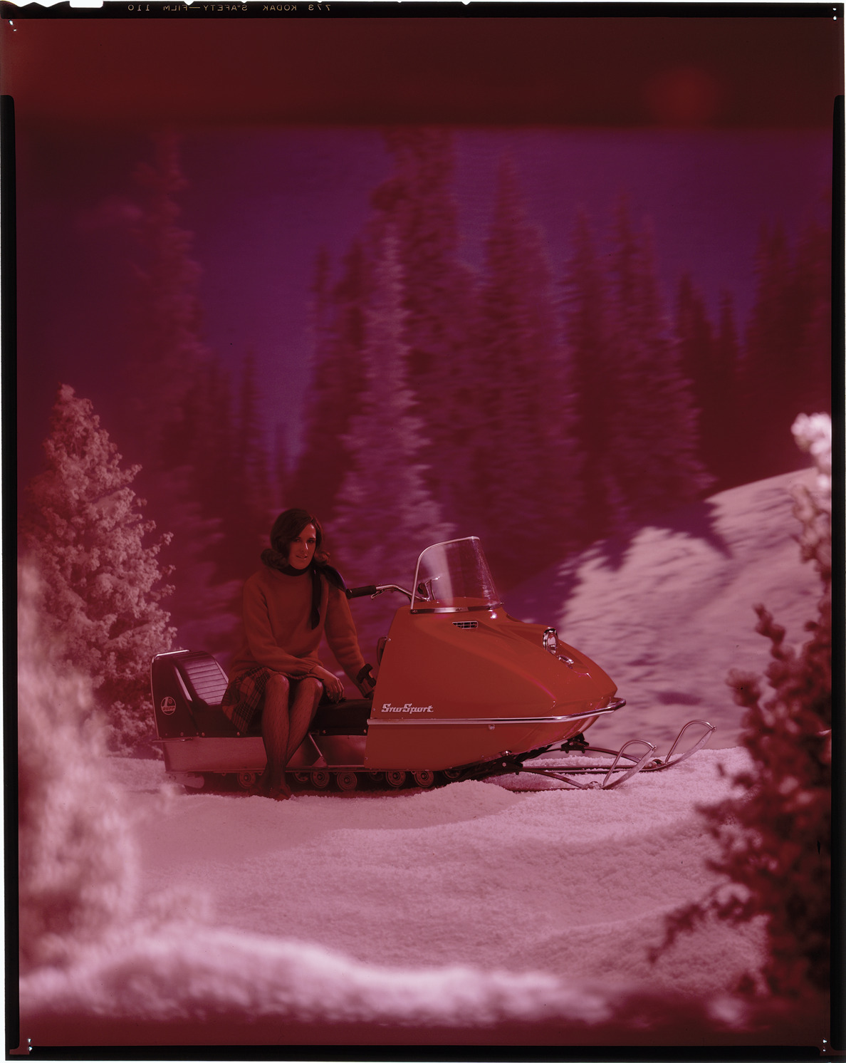 View of a woman posing with a 1969 Rupp Sno-Sport snowmobile. Label on sleeve: "Rupp Manufacturing, Sno-Sport, 1969."