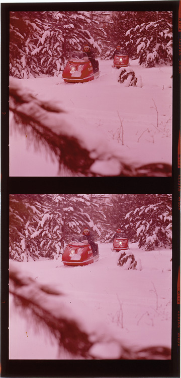 Two views of men riding two Rupp Sno-Sport snowmobiles. Label on sleeve: "Rupp Manufacturing, Sno-Sport, date unknown."