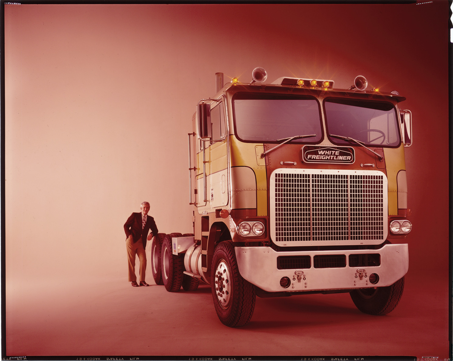 View of a man posing with a White truck cab. Label on sleeve: "White trucks, date unknown."