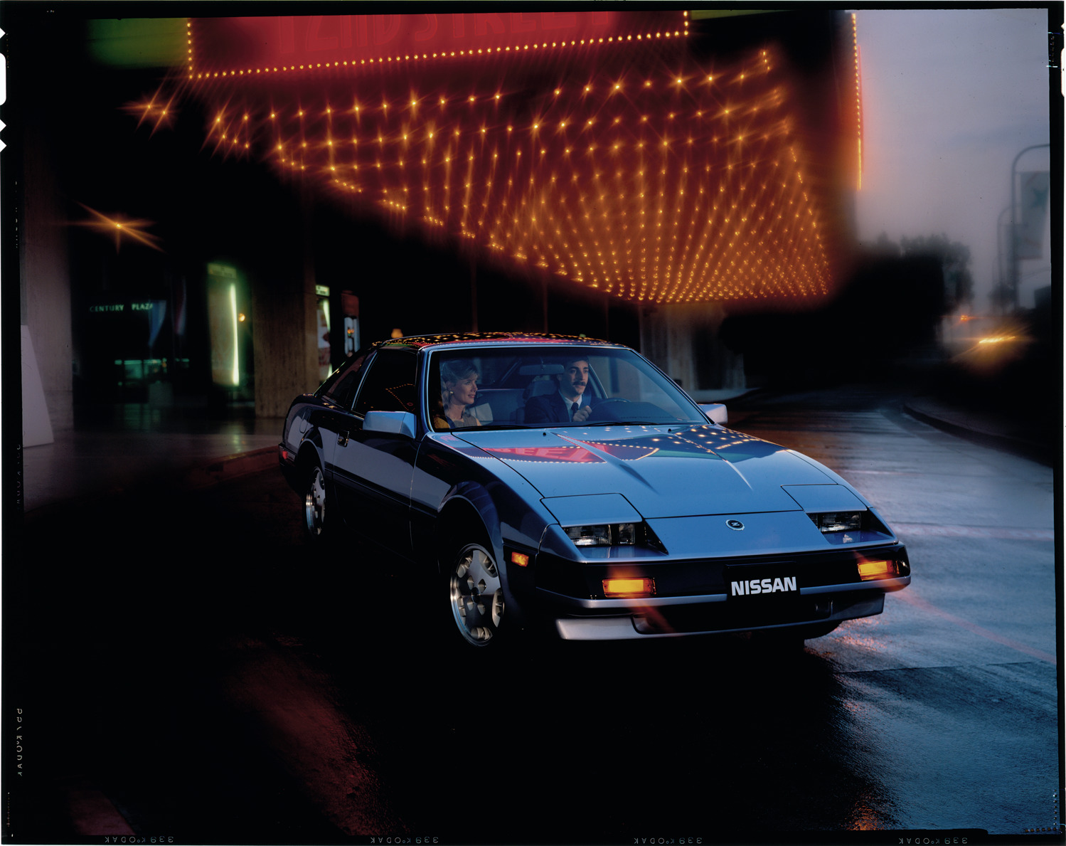 View of a man and woman in a Nissan 300ZX coupe. Theater entrance and marquee in background. Label on sleeve: "Nissan, Nissan 300ZX, 1983-89."