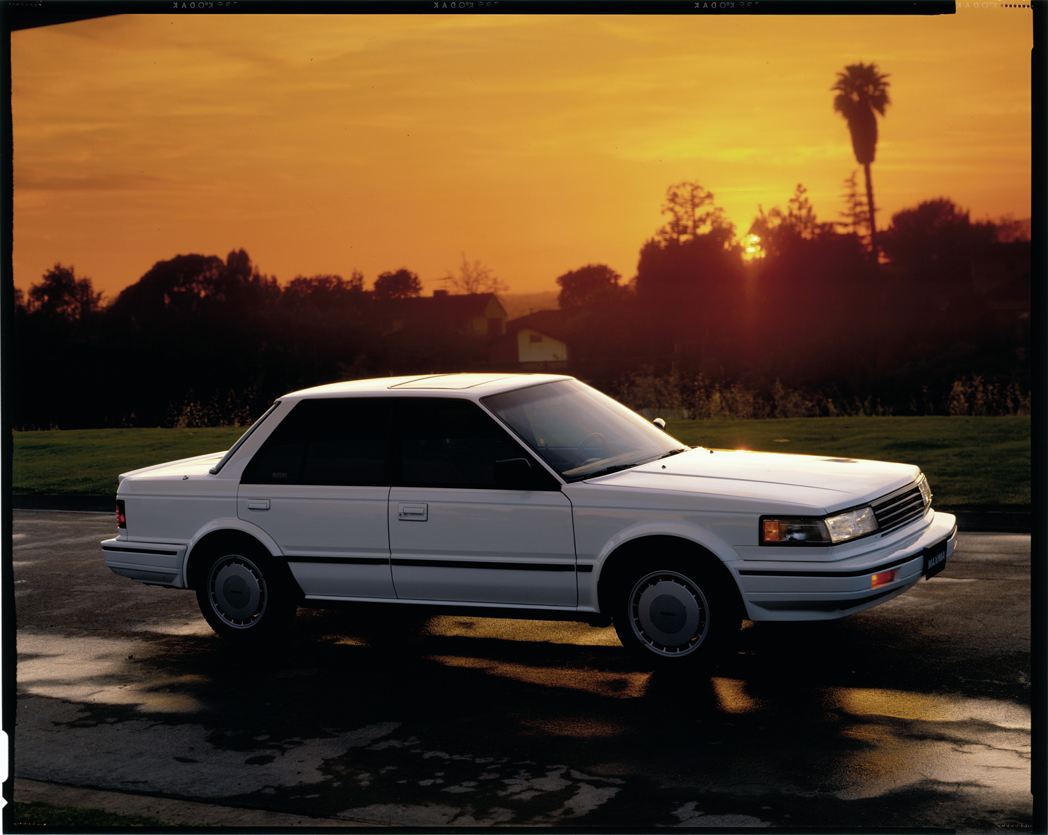 View of a Nissan Maxima sedan. Label on sleeve: "Nissan, Nissan Maxima, 1980s."