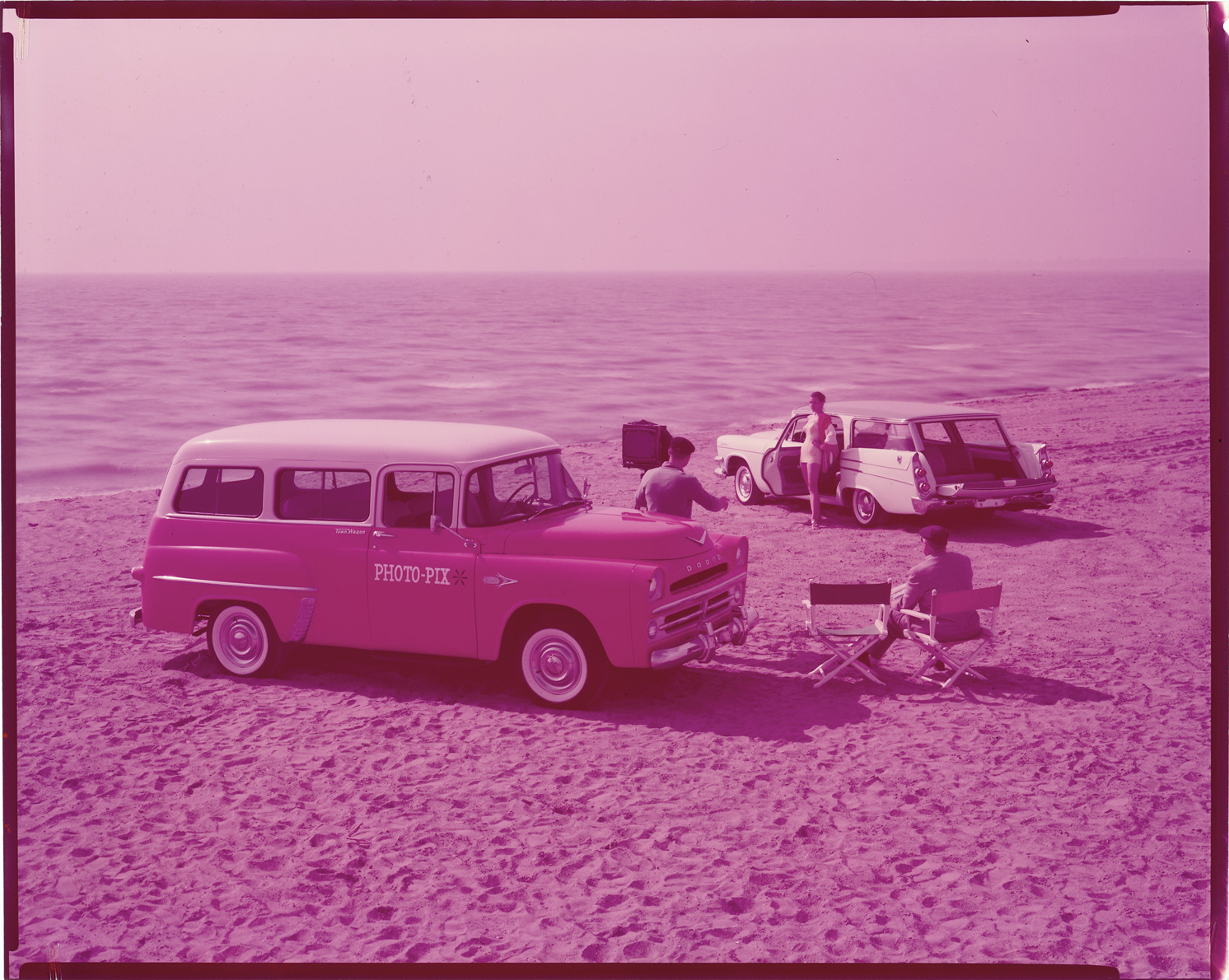 View of a woman posing with a 1957 Dodge station wagon on beach. Photographer with camera equipment stands next to Dodge Town Wagon truck in foreground; "Photo-Pix" is painted on side of truck. Label on sleeve: "Chrysler Corporation, Dodge truck/station wagon, 1957."