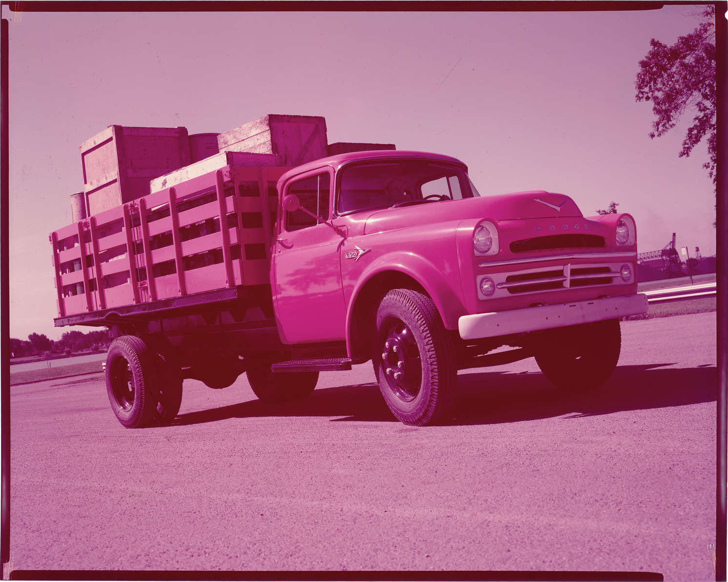 Favorite this☆ 1957 Dodge truck Description: View of a man driving a 1957 Dodge truck, hauling a load of wooden crates. Label on sleeve: "Chrysler Corporation, Dodge trucks (500), 1957." Details Resource ID: na039667 Creator: Boulevard Photographic (Firm) Subject: Dodge trucks Advertising Transparencies Date Issued: 1957 Format: 1 transparency : col. ; 8 x 10 in. Member of: National Automotive History Collection Mickey McGuire and Jim Northmore Boulevard Photographic Collection Filing Location: Dodge, 15:1 Rights: Physical rights are retained by DPL. Copyright is retained in accordance with U.S. copyright laws.