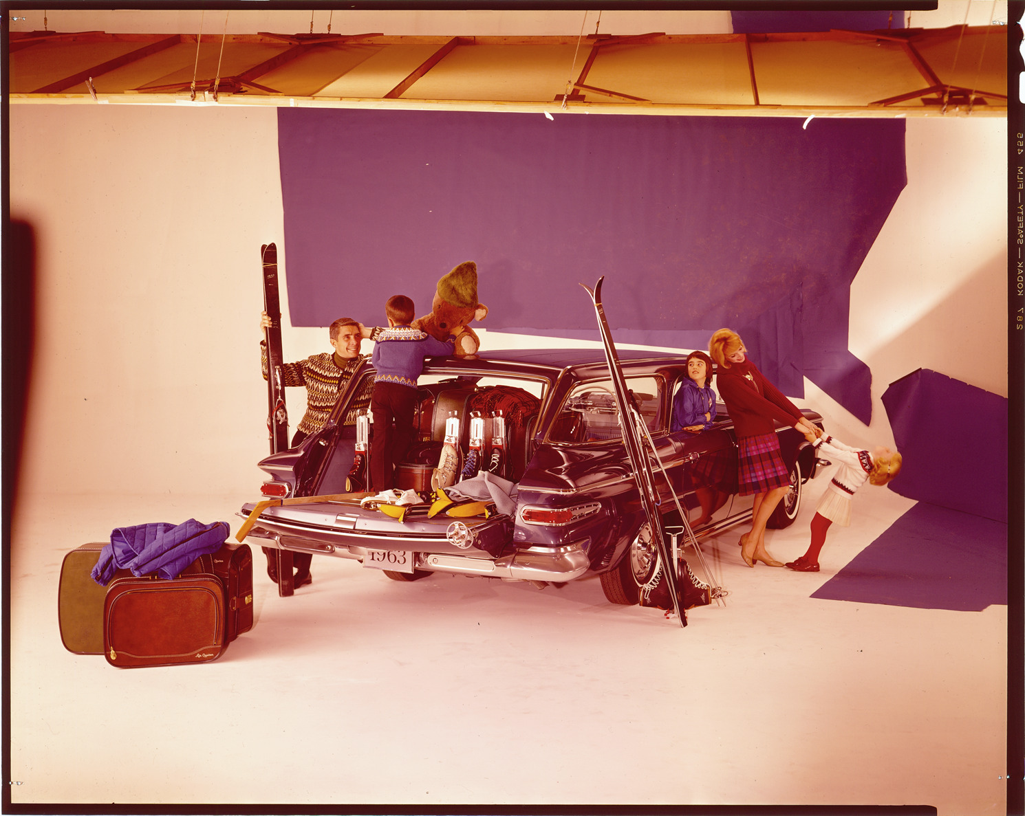 Favorite this☆ 1963 Dodge Custom 880 station wagon Description: View of a family posing with a 1963 Dodge Custom 880 station wagon. Tailgate is open, showing ski equipment. Suitcases in foreground. Label on sleeve: "Chrysler Corporation, Dodge Custom 880 wagon, 1963." Details Resource ID: na039688 Creator: Boulevard Photographic (Firm) Subject: Dodge automobile Station wagons Skis and skiing Luggage Advertising--Automobiles Transparencies Date Issued: 1963 Format: 1 transparency : col. ; 8 x 10 in. Member of: National Automotive History Collection Mickey McGuire and Jim Northmore Boulevard Photographic Collection Filing Location: Dodge, 15:2 Rights: Physical rights are retained by DPL. Copyright is retained in accordance with U.S. copyright laws.