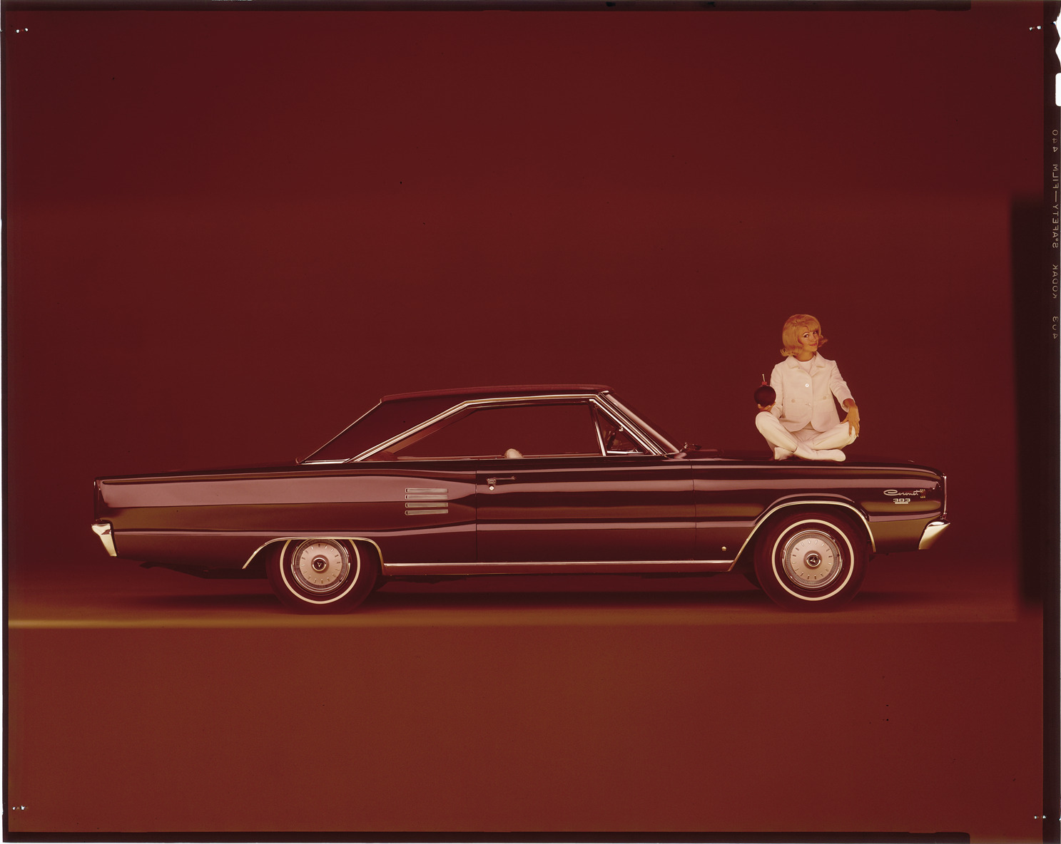 View of a woman, holding a bomb, posing with a 1966 Dodge Coronet 500 coupe. Label on sleeve: "Chrysler Corporation, Dodge Coronet 500, 1966."