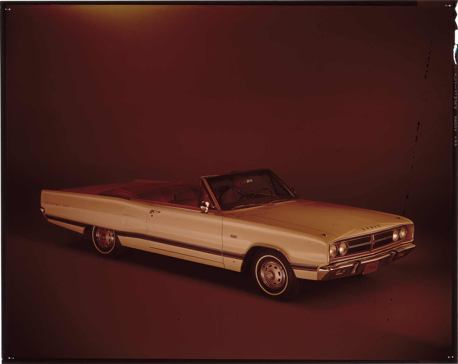 View of a man posing in a 1967 Dodge Coronet 500 convertible. Label on sleeve: "Chrysler Corporation, Dodge Coronet 500, 1967."
