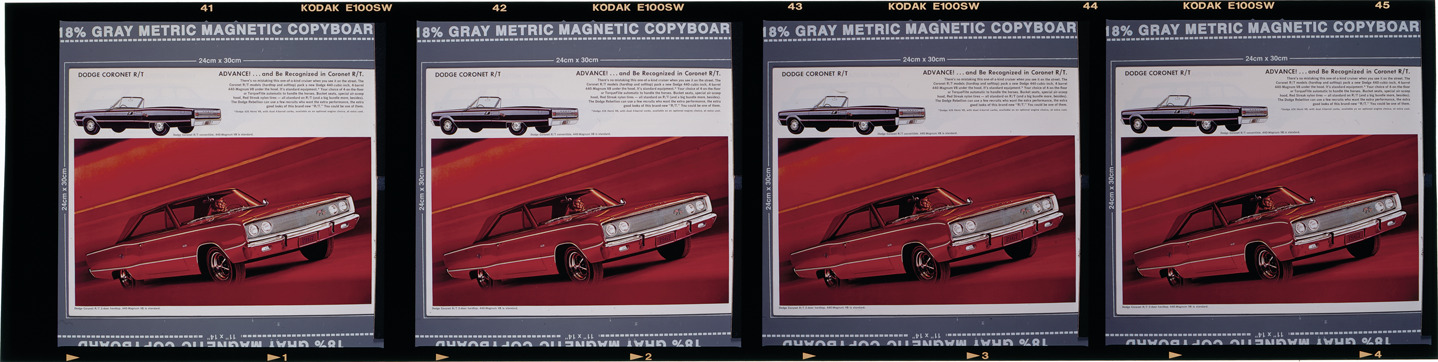 Four views of a woman posing in a 1967 Dodge Coronet R/T convertible in an advertisement. Printed on front: "Dodge Coronet R/T. Advance! ... and be recognized in Coronet R/T. There's no mistaking this one-of-a-kind cruiser when you see it on the street. The Coronet R/T models (hardtop and softtop) pack a new Dodge 440 cubic inch, 4-barrel 440-Magnum V8 under the hood. It's standard equipment.* Your choice of 4-on-the-floor or TorqueFlite automatic to handle the horses. Bucket seats, special air-scoop hood, Red Streak nylon tires -- all standard on R/T (and a big bundle more, besides). The Dodge Rebellion can use a few recruits who want the extra performance, the extra good looks of this brand-new R/T. You could be one of them. Dodge 426 Hemi V8, with dual 4-barrel carbs, available as an optional engine choice, at extra cost. Dodge Coronet R/T convertible. 440 Magnum V8 is standard." Label on sleeve: "Chrysler Corporation, Dodge advertising, 1967."
