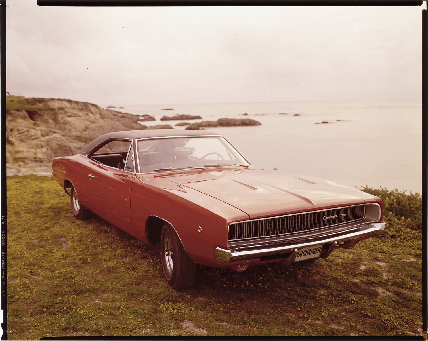View of a 1968 Dodge Charger coupe on shoreline. Label on sleeve: "Chrysler Corporation, Dodge Charger, 1968."