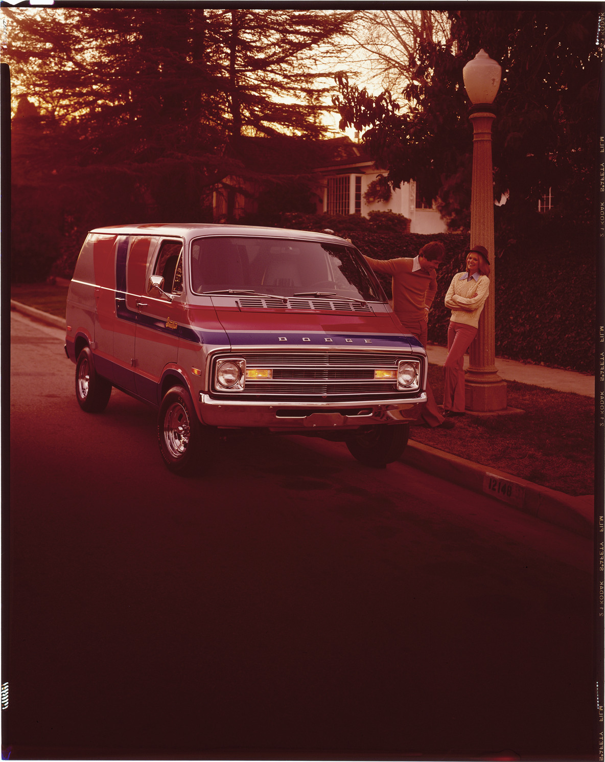 View of a man and woman posing with a Dodge van. Label on sleeve: "Chrysler Corporation, Dodge van, 1970s."