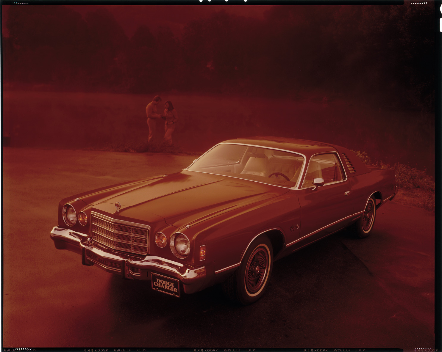 View of a man and woman posing with a Dodge Charger coupe. Label on sleeve: "Chrysler Corporation, Dodge Charger, 1975-77."