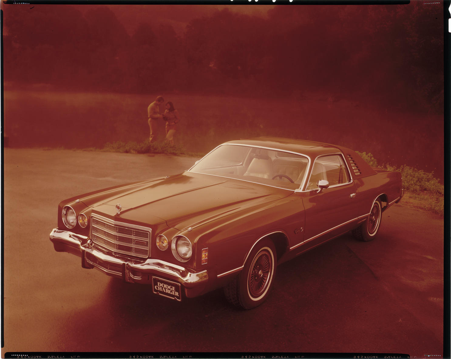 View of a man and woman posing with a Dodge Charger coupe. Label on sleeve: "Chrysler Corporation, Dodge Charger, 1975-77."