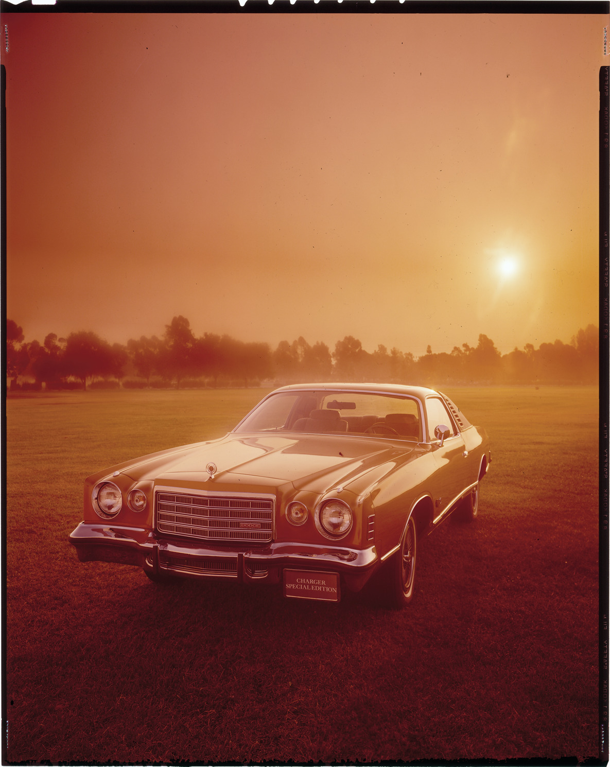 View of a man and woman posing with a Dodge Charger coupe. Label on sleeve: "Chrysler Corporation, Dodge Charger, 1975-77."