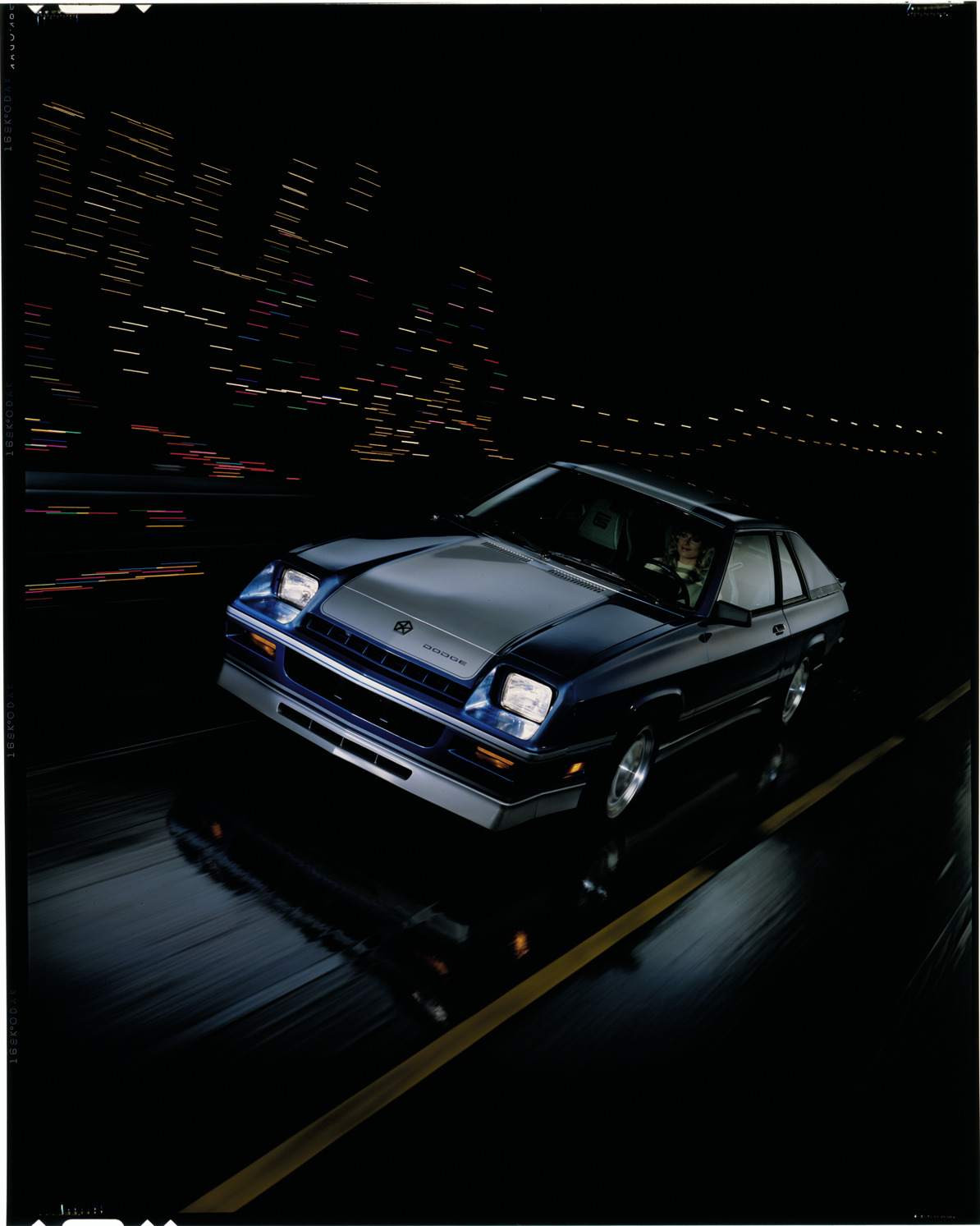 Nighttime view of a woman posing in a Dodge Charger coupe. Label on sleeve: "Chrysler Corporation, Dodge Charger, 1983-1987."