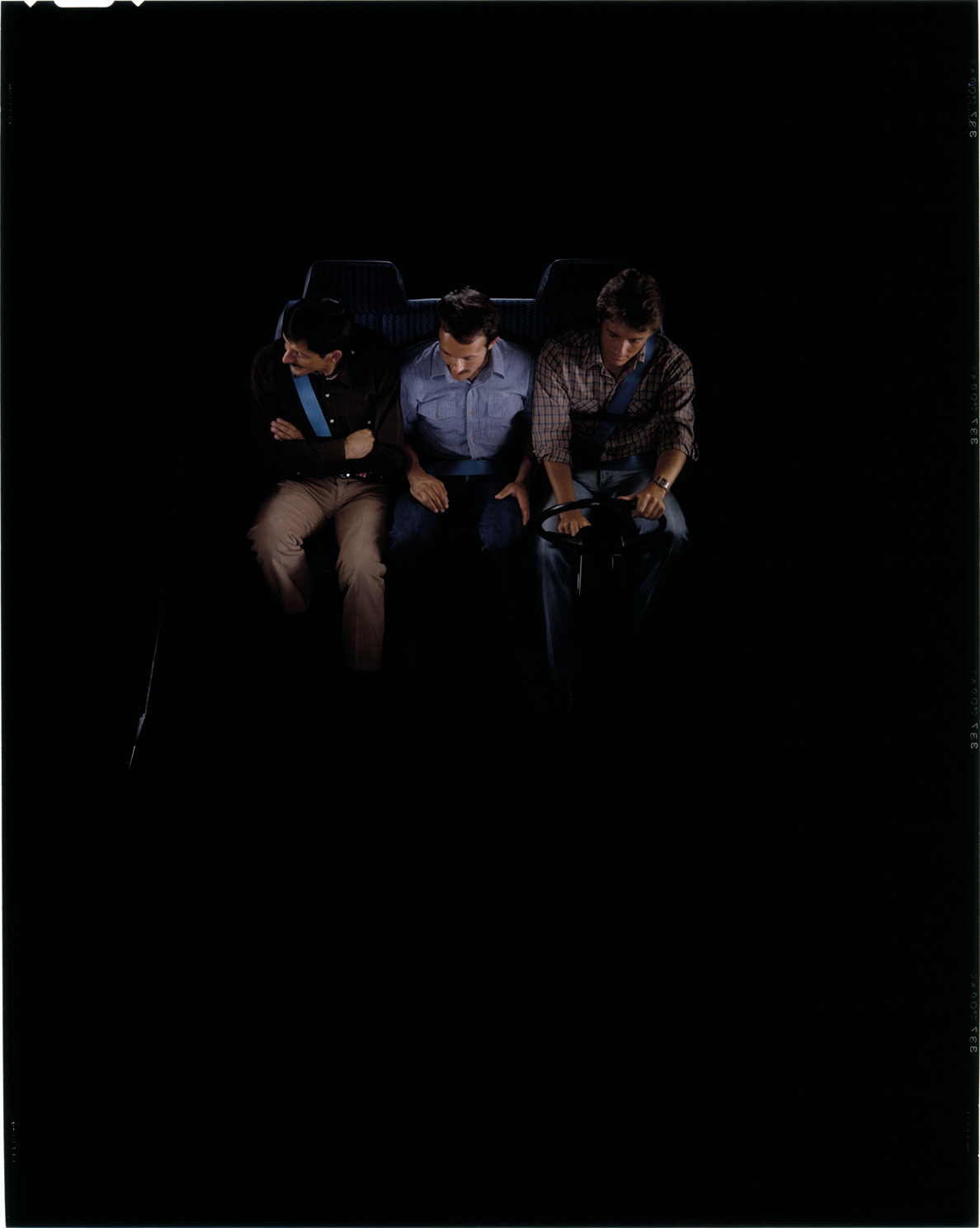 View of three men sitting in a Toyota car. Label on sleeve: "Toyota, Toyota advertising, 1980s."