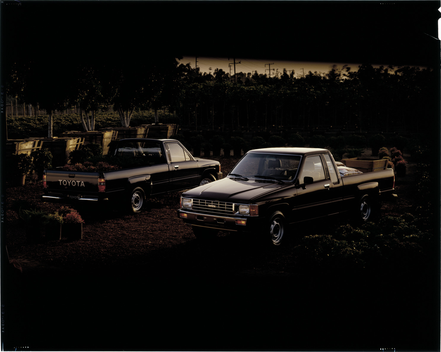 View of two Toyota trucks at a nursery. Label on sleeve: "Toyota, Toyota trucks, 1980s-90s."