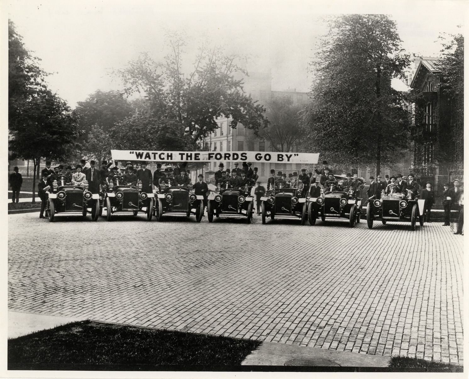 View of motorists posing in row of Ford cars, parked on brick street. "Watch the Fords go by" banner is displayed in background. Seven Ford Model K automobiles were loaned to the Adcrafters, a Detroit advertising association, for their annual meeting on June 11, 1907. Left to right: four 1907 Ford touring cars, one 1906 touring car, a 1907 touring car and a 1907 roadster. Handwritten on back: "Ford, ca. '07."