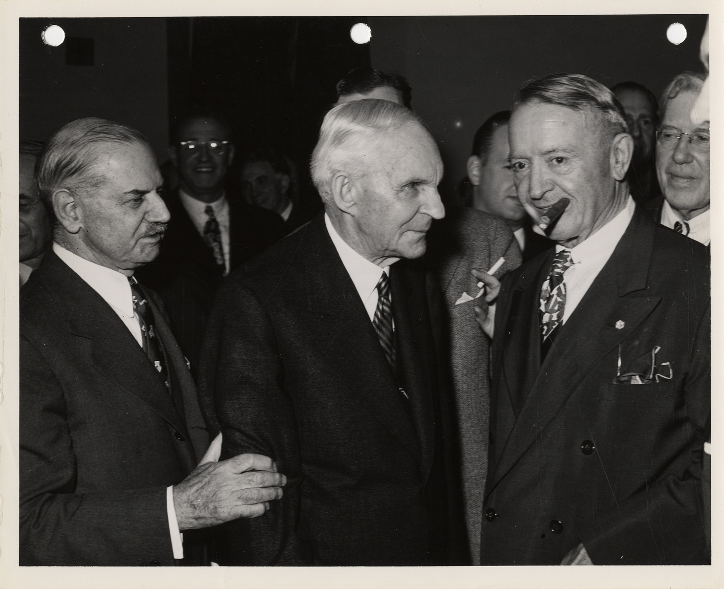 Close-up view of Charles W. Nash, Henry Ford and Barney Oldfield at the Detroit Automotive Golden Jubilee Pioneers Tribute. Typed on back: "Subject: Detroit Automotive Golden Jubilee - Pioneers Tribute; Date: May 31, 1946; Photographer: not given; Photo Number/Negative Number: MS 7-285, folder 16; Source: Detroit Automotive Golden Jubilee Collection; Identification: Behind the stage, after the tribute to the automotive pioneers, are from left to right, Charles W. Nash, Henry Ford, and Barney Oldfield. These three men were part of the automotive pioneers who were honored by the Automobile Manufacturer's Association during the Automotive Golden Jubilee celebration."