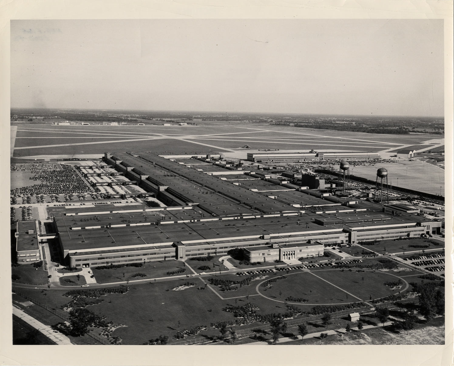 Aerial view of the Kaiser-Frazer automobile plant in Willow Run, Michigan. Stamped on back: "Photo from Kaiser-Frazer Corp., Willow Run, Mich., neg. #3860, date." Typed on back: "From: Kaiser-Frazer Corporation, Willow Run, Michigan, for immediate release. Kaiser-Frazer buys giant Willow Run plant. Willow Run, Mich. One of the largest and most complete industrial installations in the world, the government's Willow Run, ex-bomber plant, has been purchased by Kaiser-Frazer Corp. K-F, which has leased the giant plant since November, 1945, converted the war-famed factory to auto production, turning out more than 325,000 cars. The plant was purchased through the War Assets Administration at a cost of $15,100,000.