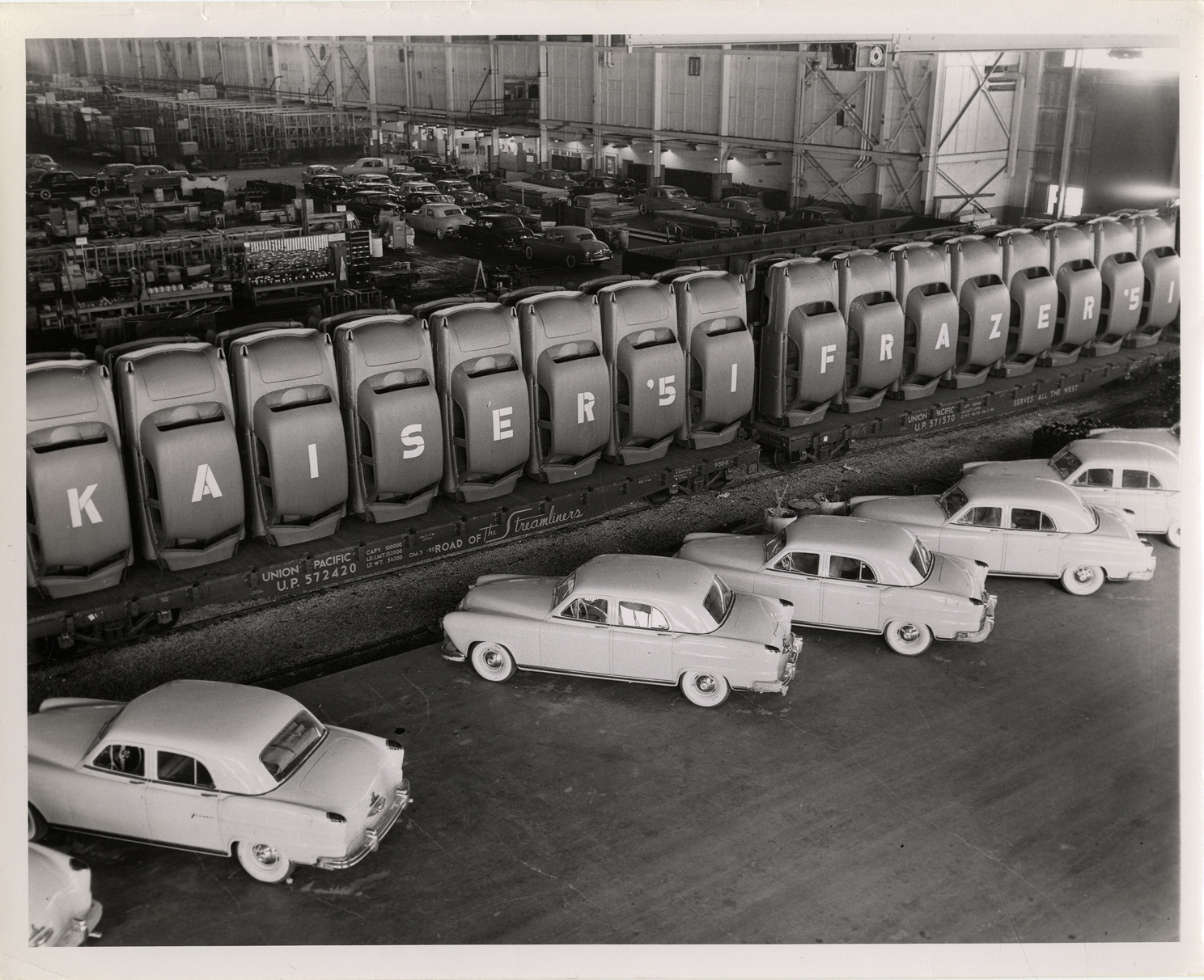 View of Kaiser cars lined up on Union-Pacific railroad flatcars inside Kaiser-Frazer automobile factory. "Kaiser, '51, Frazer, '51" is spelled out on car roofs. Row of cars are parked in foreground. Stamped on back: "Photo from Kaiser-Frazer Corp., Willow Run, Mich., neg.#, date."