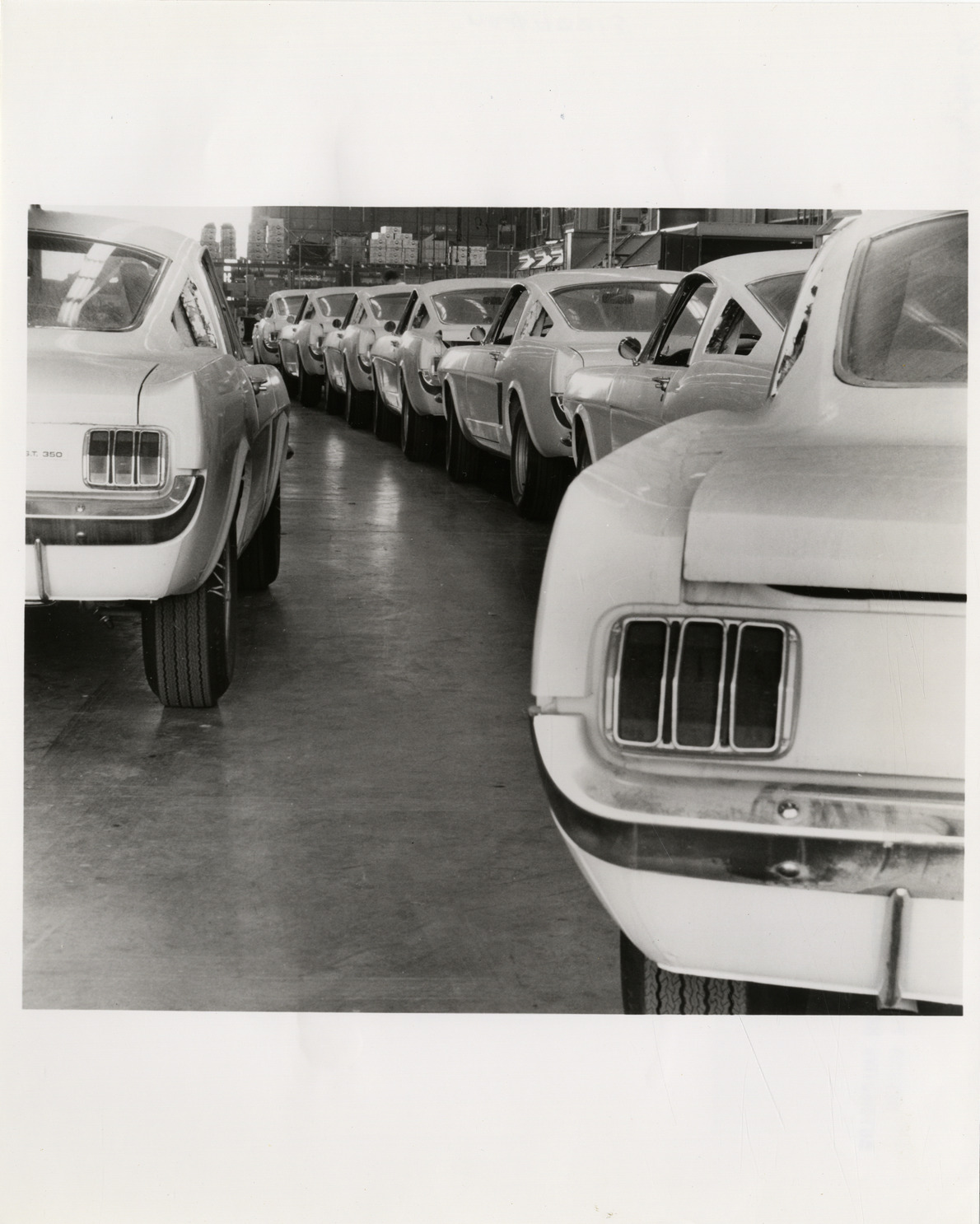 View of 1966 Shelby GT 350 cars lined up in factory. Typed on back: "Shelby GT 350 production line. Patiently waiting to be admitted to the King Cobras's Court, Carroll Shelby's 1966 Shelby GT 350's line up for installation of their new rear quarter windows and side air-scoops. Upon completion these SCCA Champions will receive the familiar GT 350 rocker-panel striping and then be shipped to the network of Shelby American franchised dealers throughout the world. Shelby American, Inc. Public Relations Department, 6501 W. Imperial Highway, Los Angeles 9, Calif. Area 213, 674-1961. Contact: Donald Rabbitt, Public Relations."