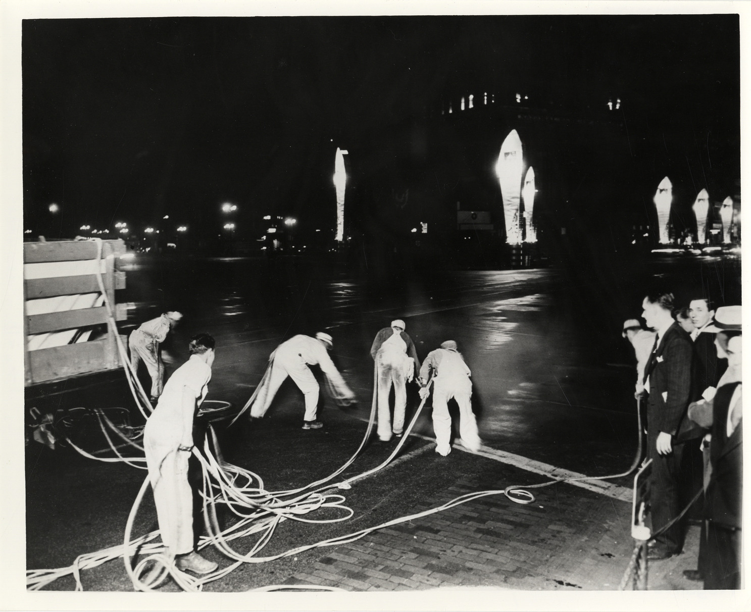 Nighttime view of workers spraying gold paint on Woodward Ave. in preparation for the Motor City Cavalcade during the Detroit Automotive Golden Jubilee celebration. Pylons decorate light posts in background. Typed on back: "Source: Detroit Automotive Golden Jubilee-Jubilee opening ceremony. Date: May 30, 1946. Photographer: MacGregor. Photo number/negative number: MS 7-219, Folder 13. Source: Detroit Automotive Golden Jubilee Collection. Identification: A view taken at night showing Detroit workers spraying gold colored paint on the streets of Woodward Avenue in preparation for the Motor City Cavalcade of old automobiles which is one of the featured celebrations to be held during the Automotive Golden Jubilee."