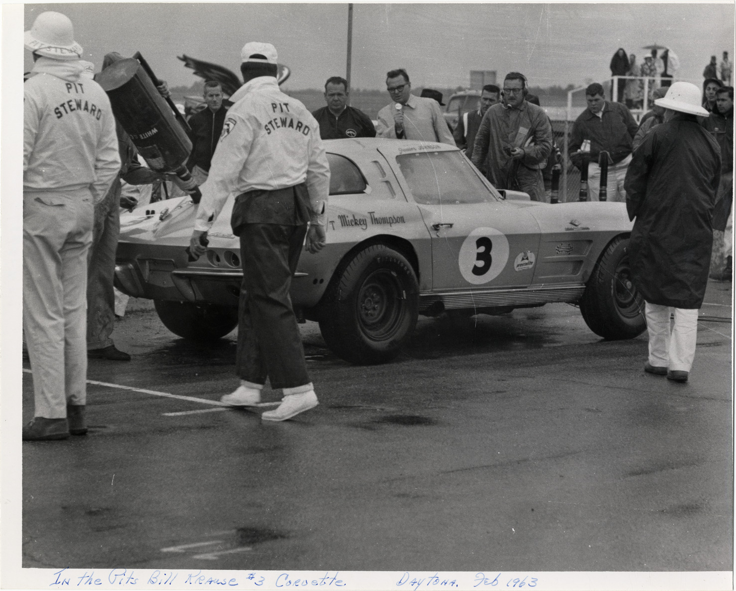 View of pit crew with Corvette racecar no. 3 at Daytona International Speedway. Journalist holding microphone in background. Handwritten on front: "In the pits, Bill Krause #3 Corvette. Daytona, Feb. 1963."