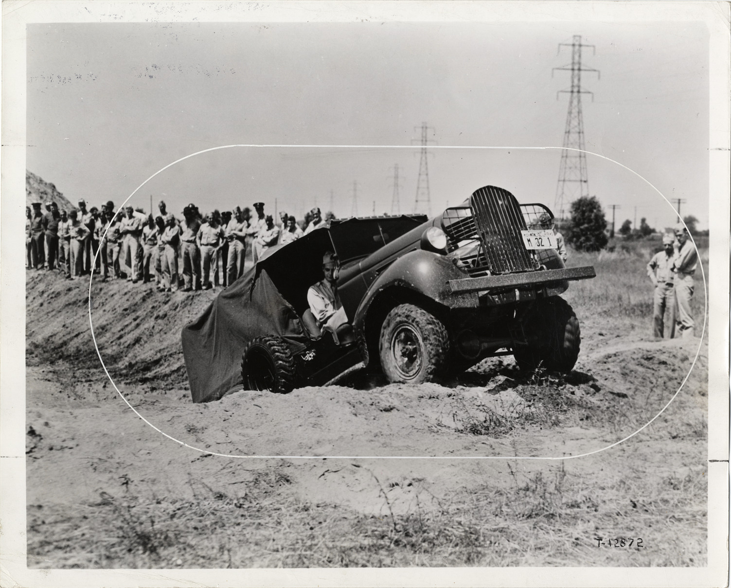 View of U.S. Army testing a Dodge truck in a ditch. Group of soldiers watch in background. Handwritten on back: "Dodge. Trucks-Testing."