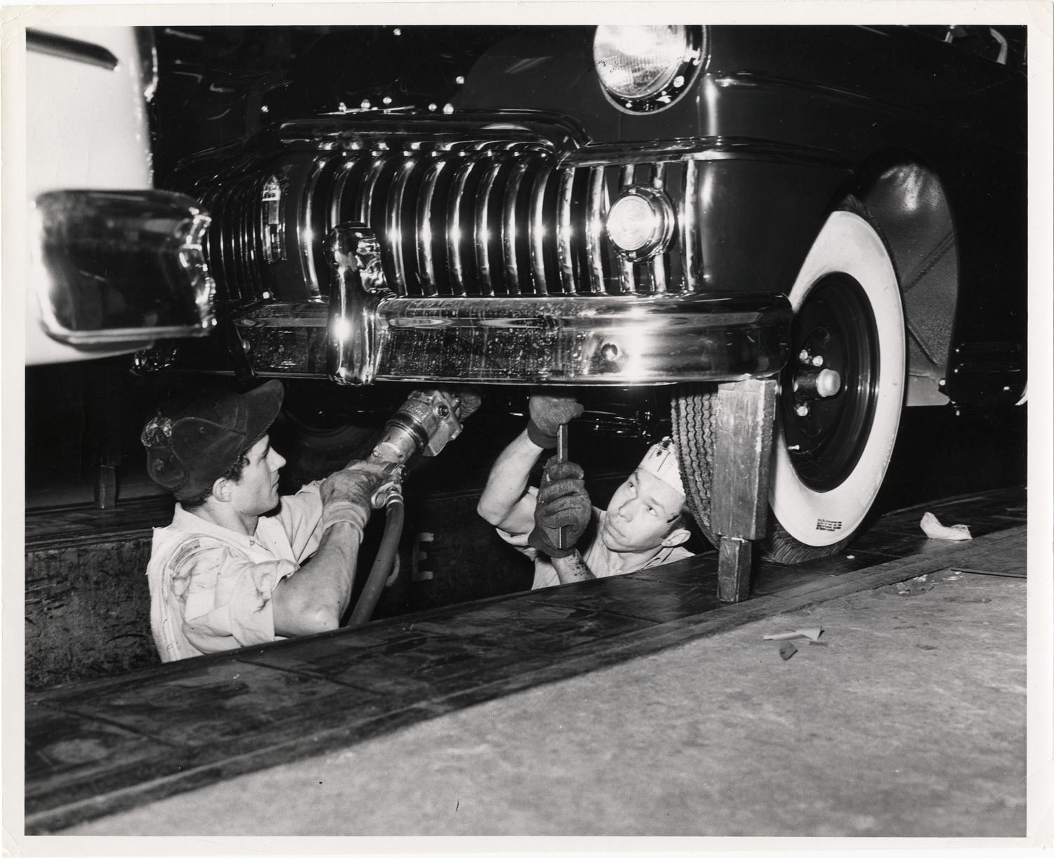 View of two assembly line workers bolting bumper onto body of DeSoto car in factory. Handwritten on back: "Close teamwork and skillful use of automatic tools are required of assembly line workers. The front bumper is being bolted on by these men in the 'pit' under the moving line. Chrysler, 1950."