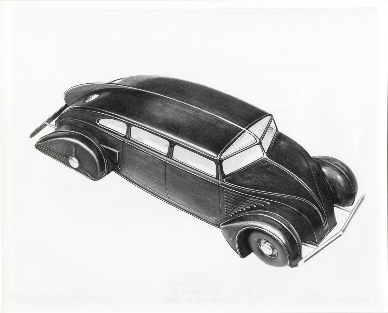 Artist's depiction of a Sterkenburg car, designed by John Tjaarda. Handwritten on back: "Luxury model Sterkenburg was to have featured 131-in. wheelbase, semi-automatic transmission and aeordynamic 'sports saloon' bodywork. Source: the John Tjaarda collection. Sterkenburg, c.1928-1931."