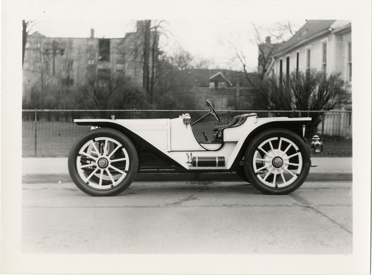 View of a 1908 American Model 50 roadster. Handwritten on back: "American 1908, Model 50 roadster."