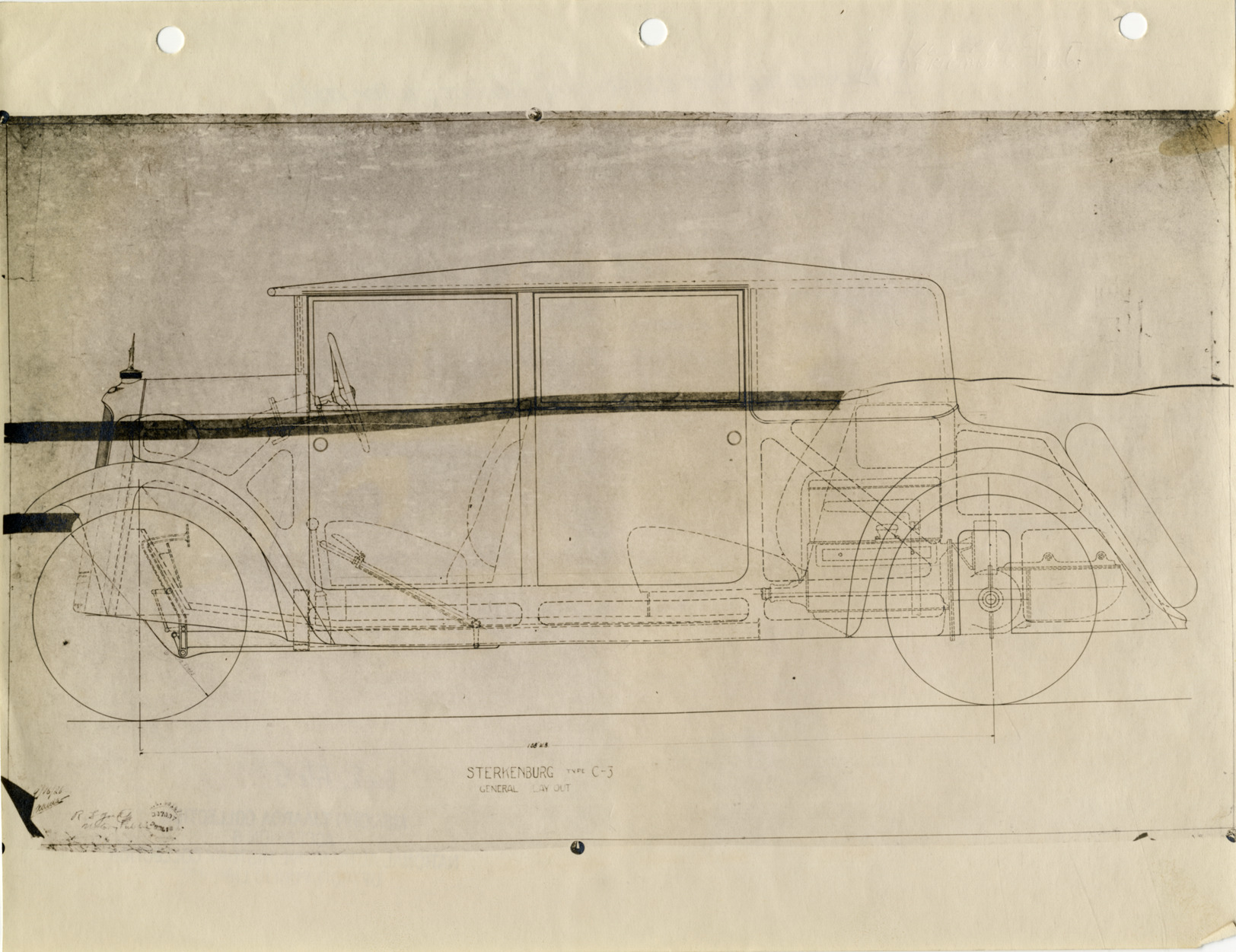 Drawing of a Sterkenburg C3 car, designed by John Tjaarda. Cutaway view shows chassis and seats. Handwritten on front: "Sterkenburg, Type C 3. General layout." Handwritten on back: "Sterkenburg Type C3, general lay-out, 16 Sep 1926."
