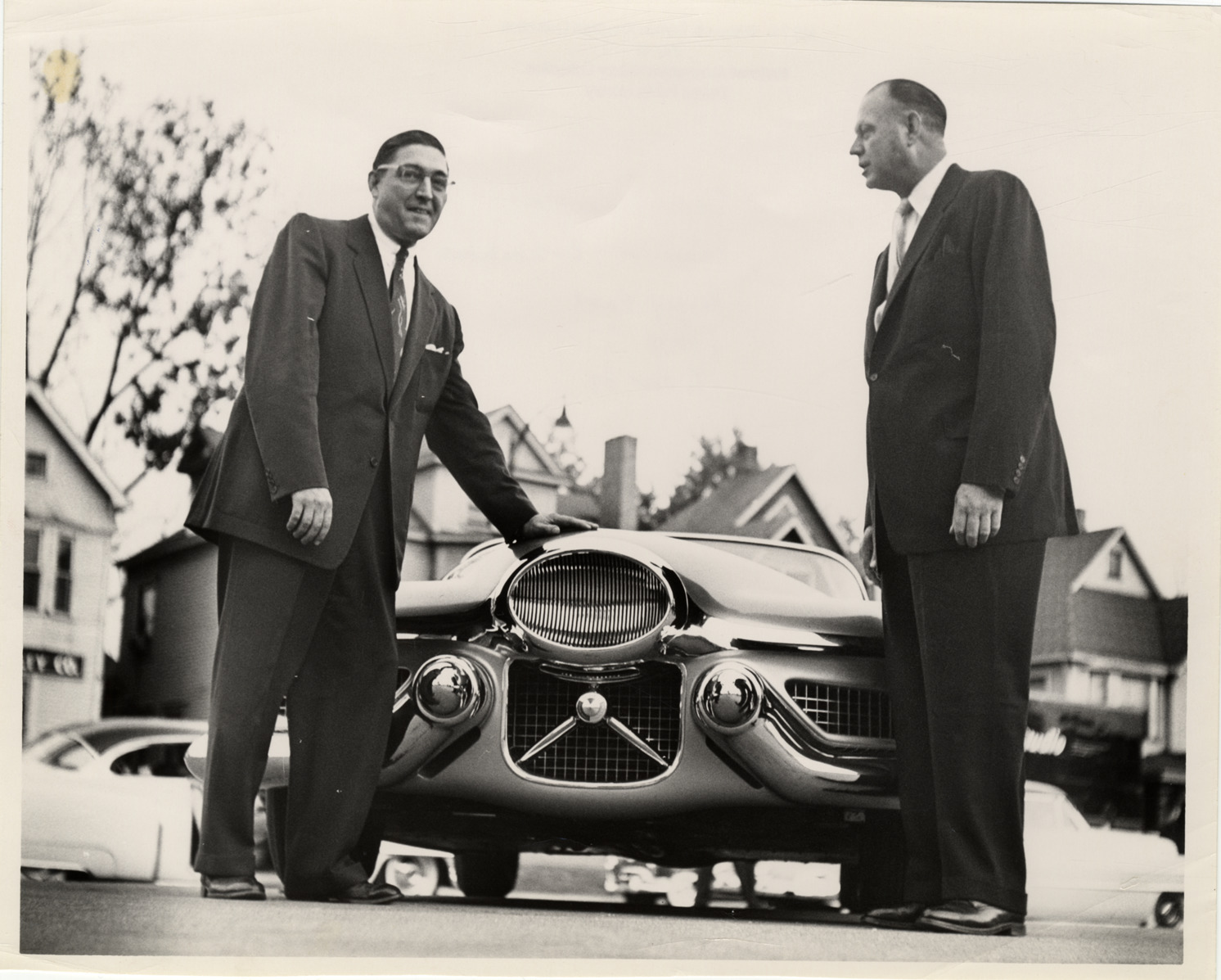 View of Semon E. Knudsen and automotive designer Harley Earl posing with an unidentified car. Handwritten on back: "Semon Knudsen, Automotive--Personalities, Harley Earl, c.1958."