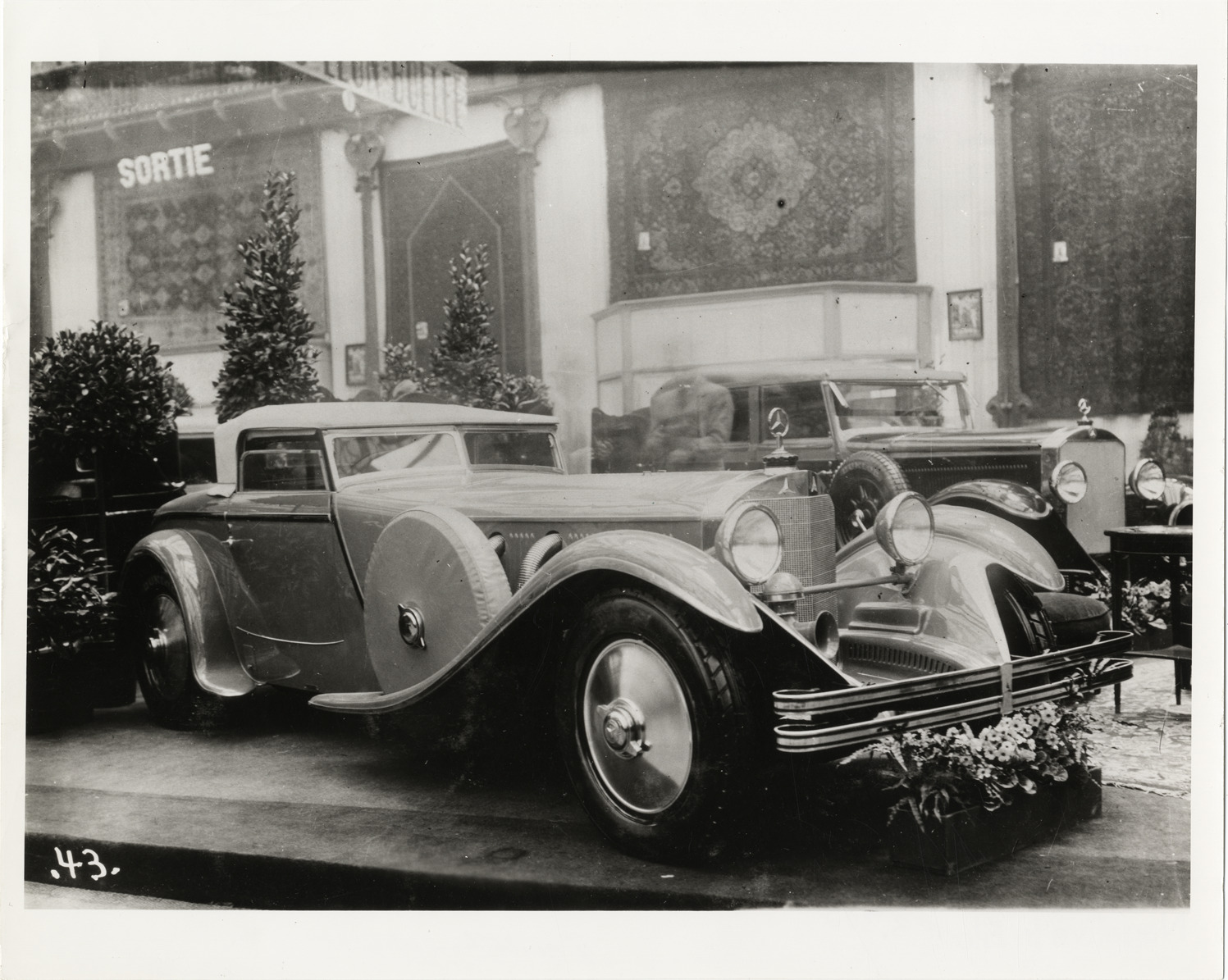 View of a 1928 Mercedes roadster, on display in exhibit hall. Typed on back: "Mercedes Benz, 36/220S, roadster 1928, Sagutchik-bodied torpedo. 2-seater."