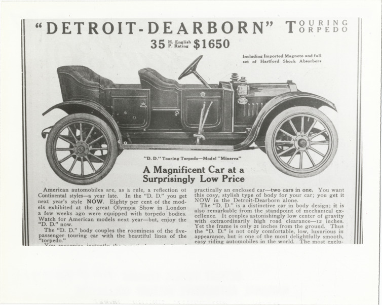 Photographic reproduction of an advertisement featuring an artist's depiction of a 1910 Detroit-Dearborn Touring Torpedo car. Printed on front: "Detroit-Dearborn Touring Torpedo. 35 h.p. English rating. $1650. Including imported magneto and full set of Hartford shock absorbers. 'D.D.' Touring Torpedo - Model 'Minerva.' A magnificent car at a surprisingly low price." Advertising copy is truncated. Label on back: "Detroit-Dearborn, 1910 Torpedo Touring, WLB."