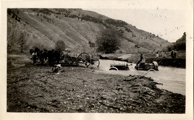 View of Erwin George "Cannonball" Baker driving a Stutz Bearcat, Series F roadster across the Ruidoso River in New Mexico during a 1915 transcontinental trip from San Diego, California to New York, New York. Horse-drawn wagon on left. Handwritten on back: "This is 3 or 4 miles from the otter ford on Ruidoso River. Stutz trip, 1915."