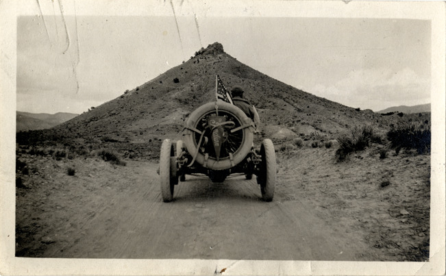 Rear view of Erwin George "Cannonball" Baker in Stutz Bearcat, Series F roadster at the Sacramento Mountains near Alamogordo, New Mexico during a 1915 transcontinental trip from San Diego, California to New York, New York. Handwritten on back: "In Sacramento Mtns., New Mex. just outside of Alamogordo, New Mex. Erwin George 'Cannonball' Baker.Stutz trip, 1915."