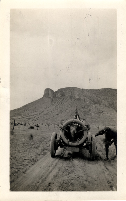 View of Erwin George "Cannonball" Baker checking rear tire on a Stutz Bearcat, Series F roadster in the desert near Bisbee, Arizona during a 1915 transcontinental trip from San Diego, California to New York, New York. Handwritten on back: "Near Bisbee. Erwin George 'Cannonball' Baker. Stutz trip, 1915."